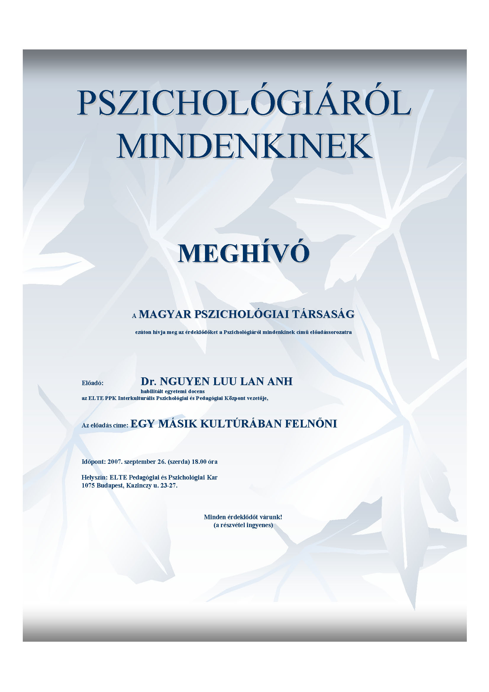 Buổi thuyết trình "Trưởng thành trong một nền văn hóa khác" của PGS TS Nguyễn Lưu Lan Anh được Hiệp hội Tâm lý học Hungary tổ chức vào hồi 18 giờ trong khuôn khổ loạt bài giảng "Tâm lý học cho tất cả mọi người", tại hội trường ở số nhà 23-27, phố Kazinczy (Quận VI I, Budapest). Có thể đến dự miễn phí.