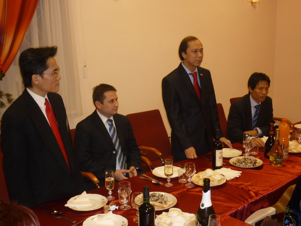 Trong tiệc chiêu đãi, các vị khách quý Hungary đã cùng đại diện ĐSQ và đại diện các hội đoàn trong cộng đồng nâng cốc chúc năm mới và thưởng thức những món ẩm thực truyền thống Việt Nam.