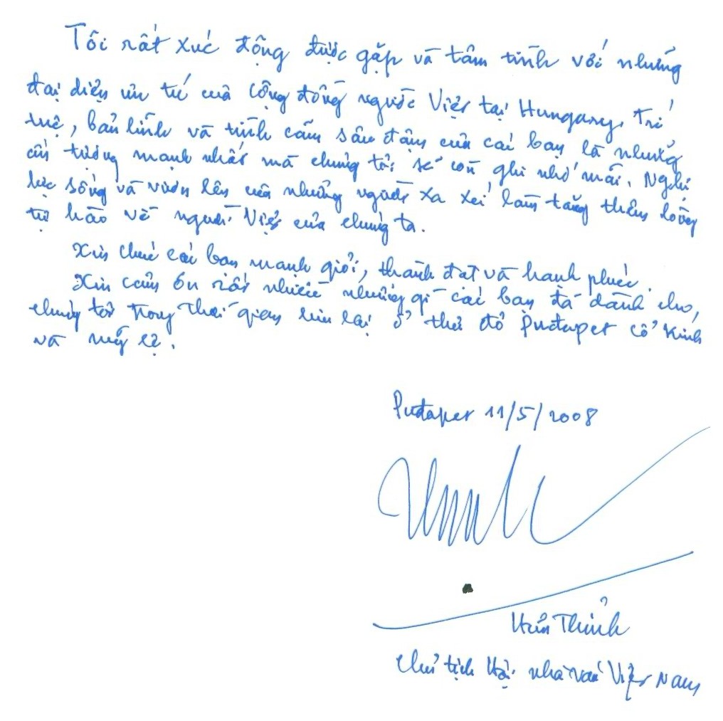 Ngày 11-5, sau khi đi thăm một số danh thắng của thủ đô Budapest, hai ông đã quay về Praha. Thay mặt đoàn, nhà thơ Hữu Thỉnh đã ghi lại những ấn tượng rất sâu đậm về đất nước Hungary và cộng đồng Việt Nam tại Hungary.