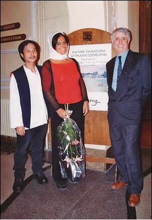 Họa sĩ Lê Thương và các bạn hữu (ký giả Varga Gábor Vilmos và nữ nghệ sĩ điêu khắc Hargitta Mecseli) trong kỳ triển lãm