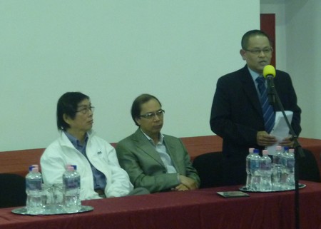 Đạo diễn Đặng Nhật Minh (ngoài cùng, bên trái) cùng Đại sứ Nguyễn Quốc Dũng và Phó Chủ tịch Hiệp hội người Việt Nam tại Hungary Lê Hữu Thủy trong buổi chiếu “Đừng đốt” tại Trung Tâm Thăng Long (Budapest, tối 30-4-2010)