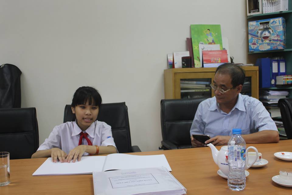 Màn đọc những cuốn sách chữ nổi dĩ nhiên chỉ duy nhất có cháu biết. Nhưng quan trọng là phó giám đốc NXB đồng thời là con trai nhà văn Nguyễn Huy Tưởng rất xúc động khi nghe cháu đọc rõ ràng những dòng chữ, mà nếu lướt qua người sáng chỉ thấy nó là những chấm tròn, trên trang giấy trắng nguyên. Ơ thế mà cháu đọc ra chữ, thế mới tài! Mọi người đều ngồi chăm chú nghe, lặng người hoặc ồ lên thán phục mỗi khi đặt câu hỏi với cháu.
