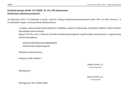 Toàn văn quyết định khen thưởng của Tổng thống Hungary Sólyom László đăng trên “Công báo Hungary”