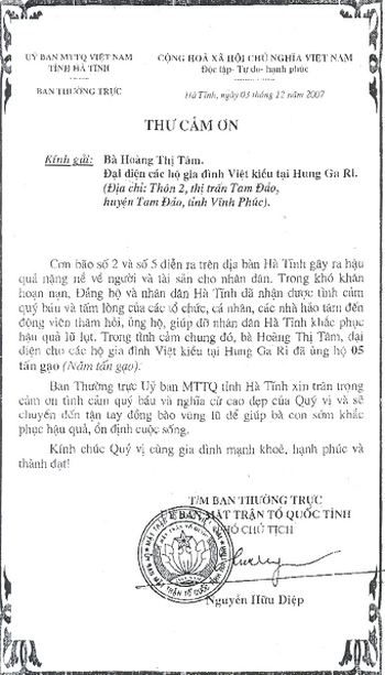 Thư cám ơn của Ban thường trực Ủy ban Mặt trận Tổ quốc Việt Nam tỉnh Hà Tĩnh