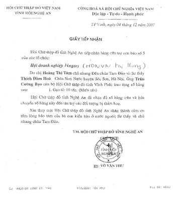 Một phần số tiền được quyên góp (7.500 USD, tương đương 15 tấn gạo) đã được chuyển đến tận tay đồng bào cần được hỗ trợ dưới hình thức nhu yếu phẩm. Như HDN đã thông báo, vào ngày 3-12-2007, kết hợp với Tổng hội Phật giáo Việt Nam (do thượng tọa Thích Hòa Đàm đại diện), HDN đã mua gạo, thuê xe và chuyên chở xuống tận địa phương để trao cho từng hộ gia đình. Chuyến đi của Đoàn cứu trợ về ba huyện có rất nhiều bà con gặp hoạn nạn - Kỳ Anh (Hà Tĩnh), Kế Phong (Nghệ An) và Tương Dương (Nghệ An) – đã đạt nhiều dư âm tốt đẹp; ngay sau đó, HDN đã nhận được thư cám ơn của Ban thường trực Ủy ban Mặt trận Tổ quốc Việt Nam tỉnh Hà Tĩnh và của Hội Chữ Thập Đỏ tỉnh Nghệ An (đăng kèm thông báo này) tri ân tấm lòng hảo tâm của các doanh nghiệp Việt Nam tại Hungary.