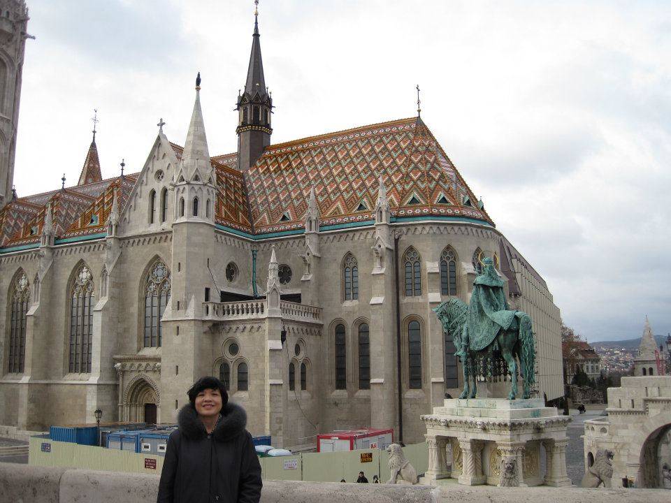 Chị Hoàng Ánh trên Thành Người đánh cá - phía sau là Nhà thờ Mátyás và tượng vua István Đệ nhất (Hoàng Thành Budapest)
