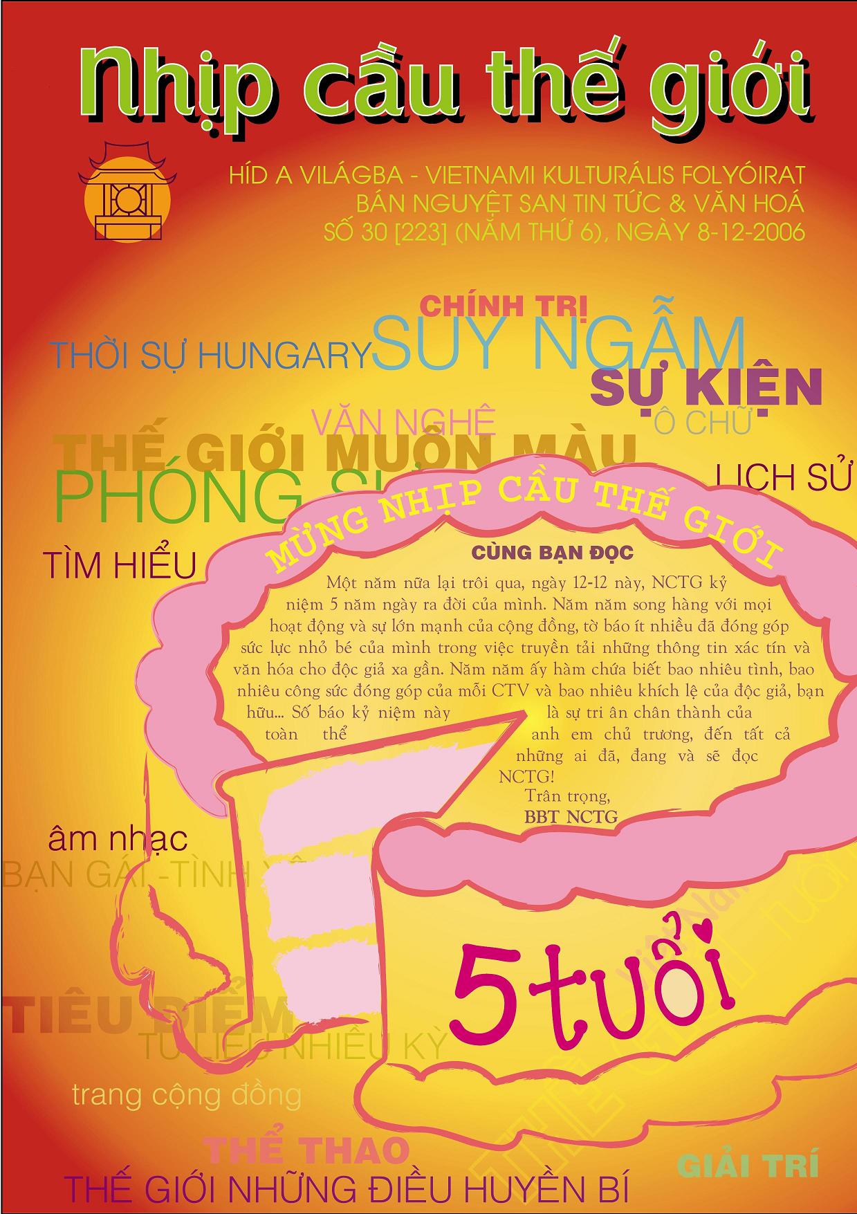 Ngày 12-12-2006, “Nhịp cầu Thế giới” (NCTG) tròn 5 tuổi. Số đầu tiên của NCTG ấn hành ngày 12-12-2001 tại Budapest, Hungary. Với độc giả chưa có dịp làm quen với NCTG, có thể xem số ra ngày 24-11-2006 ở đây và ở đây.