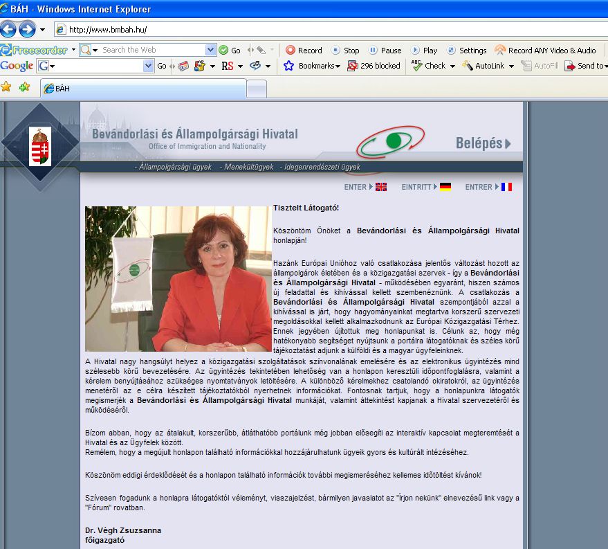 Trang online của Cục Nhập cư và Quốc tịch (BÁH), cơ quan quản lý Ngoại kiều của Hungary