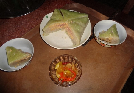 Và đây là kết quả bánh do ông xã tôi gói, không dùng lá riềng hay lá dứa để nhuộm màu gì cả, chỉ là màu xanh của lá dong.