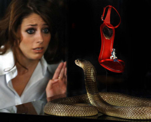 Anh: Chú rắn hổ mang Ai Cập canh giữ dép của nhà tạo mẫu Rene Caovilla (Ý) tại cửa hàng Harrods (London). Giá của đôi dép đầy kim cương và đá quý này là 91.300 EURO - Ảnh: Fiona Hanson (AP)