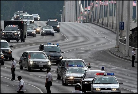 Đoàn xe của tổng thống Bush rời Budapest ra sân bay Ferihegyi - Ảnh: "Tự do Nhân dân"