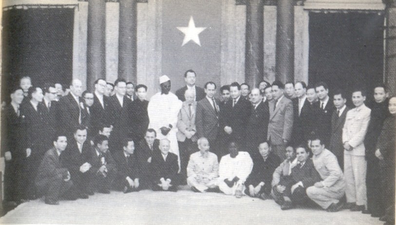 Thế rồi, khoác vai một đại biểu Pháp, một đại biểu Guninea, một đại biểu Liên Xô và một đại biểu Trung Hoa, cụ nhẹ nhàng ấn họ ngồi xuống thảm và ngồi vào giữa họ.