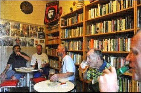 Thực khách uống bia bên giá sách ở quán Gyopár, hạt Nagykovácsi. Ở quán rượu nhỏ bé thiết kế theo kiểu thời cộng sản này, thực khách có thể vừa uống vừa đọc sách nếu muốn