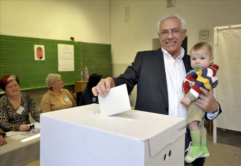 Ông Szalay Péter, một ứng viên dân biểu của FIDESZ bế cháu đi bỏ phiếu tại Quận XIII (Budapest) - Ảnh: Beliczay László (index.hu)