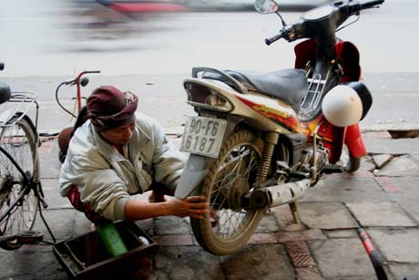 Sáng nay hai mẹ con đang đi thì thấy tay lái loạng choạng, mình dừng lại, bánh sau hết sạch hơi. Con trai lớn nên con giành phần dắt xe cho mẹ vì cũng phải đi khoảng 1 cây số nữa mới có hàng sửa xe. Có xe máy vút qua rồi dừng lại, bạn chủ tọa lần trước dừng lại:
