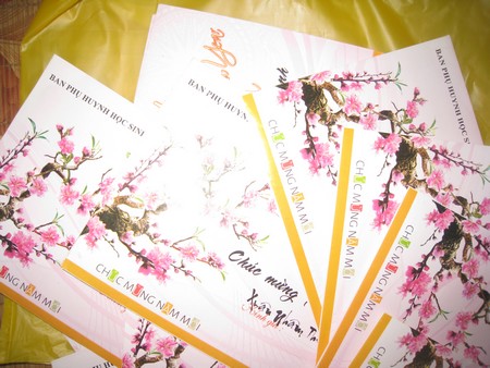 Giờ đây, mình bắt đầu in những lời chúc vào những tấm bưu thiếp cho các thầy cô giáo của con năm nay. Những tấm bưu thiếp chúc tết màu vàng da cam với hình cành đào bằng nhũ in nổi, rất đẹp và giá thành không hề rẻ chút nào...
