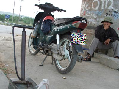 Vừa dừng, bác già nhất trong số mấy người giữ ngay xe mình lại và bảo mình ngồi vào ngồi chỗ mát. Rồi bác bắt đầu thao tác kiểm tra và rút ra một cái giống cái đinh nhưng không có tán từ lốp của mình. Đến săm thì bị thủng quá to, rồi bác lại tìm thêm được một cái đinh nhỏ nữa.