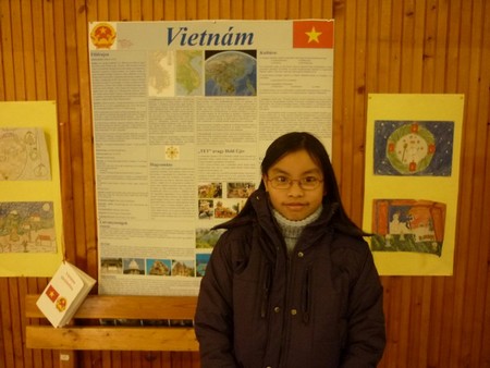 Tại trường Radnóti Miklós (Budapest), bên poster về Việt Nam do các học sinh Hungary làm nhân Những ngày Văn hóa Việt Nam được tổ chức tại trường - Ảnh: Trần Lê