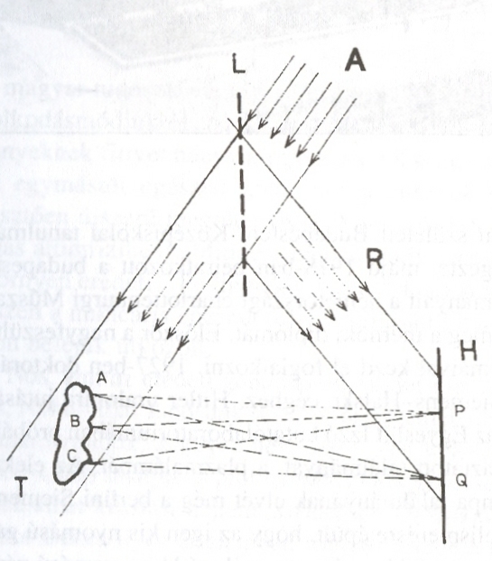 Sơ đồ phương thức chụp ảnh giao thoa lade (hologram). Chùm tia lade A được tách đôi nhờ gương bán phân L. Chùm tia qui chiếu R đến thẳng mặt ghi ảnh H, chùm kia chiếu lên vật thể T. Các tia sáng phản chiếu từ mỗi điểm A, B, C của vật thể sẽ tới tất cả các điểm P, Q của tấm H. Sóng phân tán và sóng qui chiếu sẽ được ghi lại trên tấm H