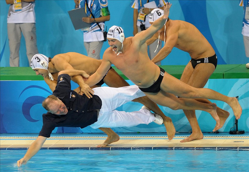 Kemény Dénes, HLV huyền thoại của bóng nước Hungary, được các cầu thủ "tung hê" xuống bể bơi sau chiến thắng của tuyển bóng nước Hungary trong trận chung kết - Ảnh: AFP