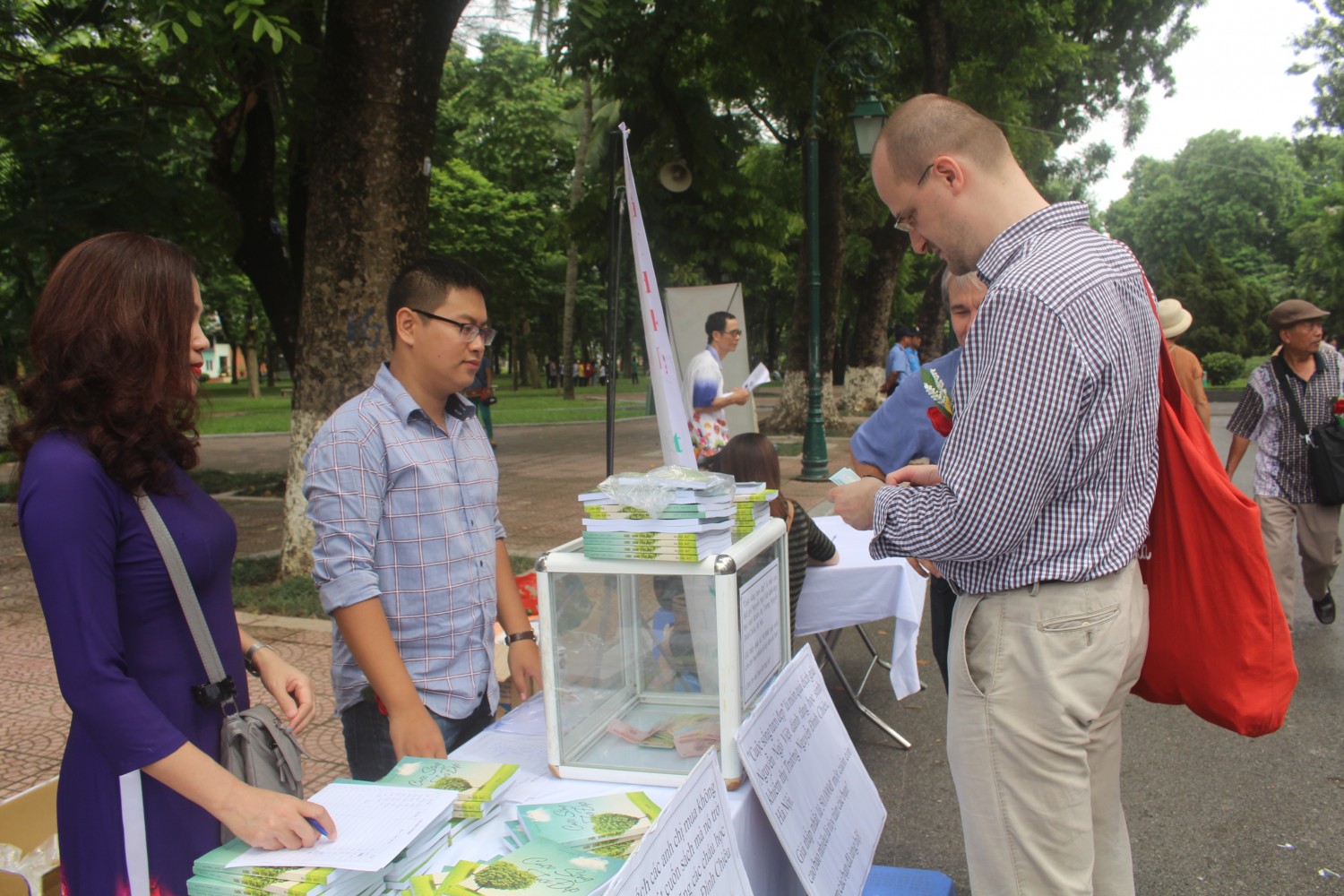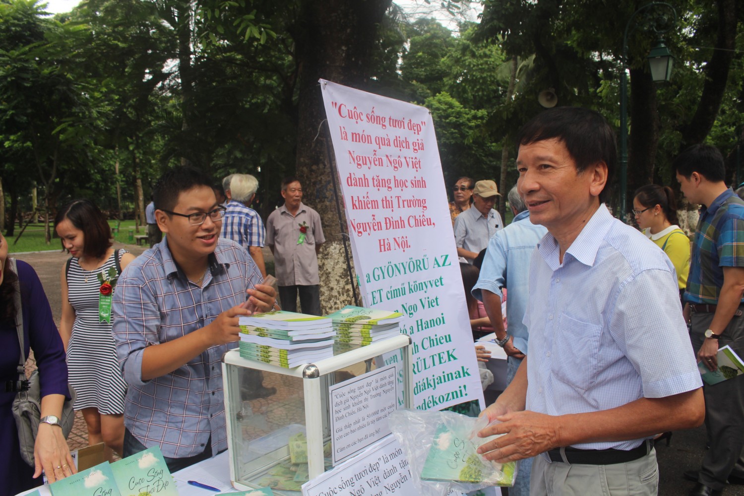 Có bác cao tuổi dừng lại đọc dòng chữ trên tấm pano, rồi hỏi người bán sách “Anh Việt là ai vậy?”. Các bạn gọi mình, mình chạy lại vừa kịp nói “anh Việt là một du học sinh bên Hung”, bác bảo “vậy à?”, rồi móc ví ra, trong ví có một tờ năm mươi nghìn, hai tờ mười nghìn, bác phân bua với mình: