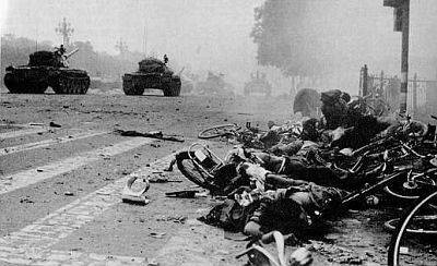 (NCTG) “Với giọng kể vẫn run rẩy, nó nói không bao giờ quên được cái cảnh bị nhốt trong xe, nhìn qua cửa kính chứng kiến tận mắt xe tăng, xe bọc thép bật đèn pha, dàn hàng ngang như máy “gặt đập liên hợp” quét qua quảng trường, máu đỏ lòm chảy thành sông, khắp nơi tiếng rên la, tiếng súng...”.