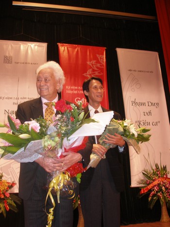 Nhạc sĩ Phạm Duy và nhạc sĩ Duy Cường trong chương trình giới thiệu “Kiều ca” tại Hà Nội (2-1-2009) - Ảnh: Trần Lê (NCTG)