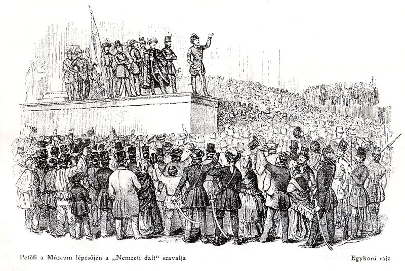Hình ảnh trong một tờ truyền đơn đương thời, mà tác giả có lẽ là Szerelmey Miklós: Petőfi Sándor đọc thi phẩm “Bài ca Dân tộc” trên bậc thềm Bảo tàng Quốc gia Hungary, ngày 15-3-1848 - Ảnh tư liệu