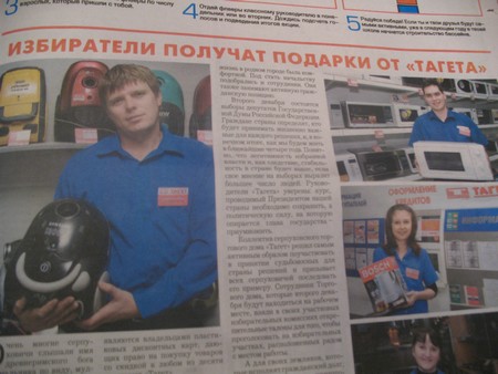 Nơi người viết bài này đang sinh sống là một thành phố nhỏ cách Moscow chừng 100 cây số. Hai ngày trước khi diễn ra cuộc bầu cử đã có thông báo dán khắp các khu nhà với chương trình cụ thể dành cho ngày 2-12. Đọc thông báo, lập tức bạn sẽ tưởng ra cảnh tưng bừng náo nhiệt của “ngày vui” sắp tới, với các màn trình diễn ca nhạc vui nhộn, các sạp bán hàng giá rẻ, những quán ăn nhanh phục vụ cử tri các món ăn truyền thống và đặc biệt, những món quà! Ở mỗi điểm bầu cử, người ta hứa rằng, nếu bạn là người bắt được tấm phiếu bầu có ghi số 50, 100, 500, 1000, 1500 - bạn sẽ được nhận một trong bốn món quà của mạng lưới siêu thị đồ điện tử - công ty “Taget”: bàn là, máy hút bụi, lò vi sóng và ấm điện đun nước. Và đó chỉ là một ví dụ rất nhỏ cho những chiêu thức được đưa ra để “dụ” dân đi bỏ phiếu.
