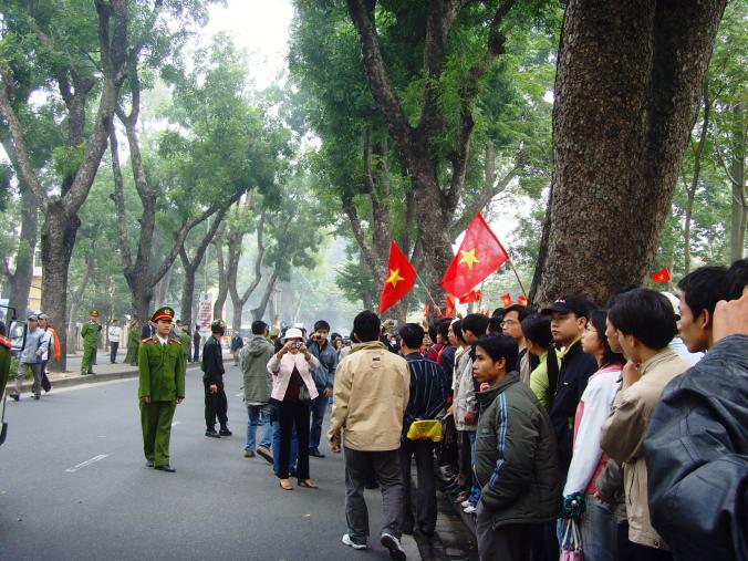 Vẫn blogger Người Buôn Gió, trong entry "Tinh thần Việt": "Bố con anh [nhiếp ảnh gia] Xuân Bình nổi bật giữa đám đông với màu đỏ chót và tấm khẩu hiệu. Cuộc biểu tình này có nhiều thành phần trong nhân dân từ cán bộ, công nhân viên, đến học sinh, sinh viên. Có phụ nữ cụ già và trẻ em. Nhiều thanh niên rất hăng hái, họ phất cờ chạy vòng rộng khích lệ tinh thần trong tiếng vỗ tay vang dội. Chưa bao giờ tôi thấy nghẹn ngào xúc động như hôm nay, người Việt Nam đã tỏ rõ tinh thần bất khuất chống ngoại xâm của dân tộc. Một cụ già được cô cháu gái dìu nói trong nước mắt: "Tôi già rồi không hô hào được, cám ơn các cháu trẻ tuổi đã làm giúp tôi. Tôi từng đổ máu bảo vệ tổ quốc này, tôi xót xa lắm, đau đớn lắm. Các cháu cứ làm đi, nếu ai bắt bớ khủng bố tôi xin đem thân già tôi ra chịu trước!". Mọi người đều xúc động trước tình cảm của cụ đối với đất nước. Anh trung niên giơ tay nói: "Dù có mất tất cả chúng ta cũng không chịu nhục, không chịu làm nô lệ. Tôi nguyện hy sinh cầm súng bảo vệ tổ quốc mình!". Đám đông giơ tay hưởng ứng. Mấy người cảnh sát xen vào nói ôn tồn: "Làm gì có ai bắt bớ mọi người đâu, mọi người giữ ôn hòa là được rồi. Mà thôi hô thế cũng đủ rồi, về nhà nghỉ ngơi thôi. Mình phản ứng thế chúng nó cũng biết, cũng thấy rồi." [...] Thái độ của những nhà chức trách trong buổi biểu tình hôm nay rất tôn trọng đám đông. Mặc dù họ tràn tới nhưng lời lẽ rất nhẹ nhàng, chân tình đại loại như: "Thôi anh, chị, cô, chú, các em về nghỉ ngơi thôi, cho bọn tôi nghỉ với. Mình hôm nay hô hào thế là nhiều rồi." Họ vừa nói vừa cười thân thiện, không hề có lời lẽ đe dọa hay hành động khiếm nhã nào. Họ cứ len vào đám đông thuyết ôm hục và chia cắt. Dường như mọi người cũng đã mệt, cho nên họ lần lượt đi về. Khi mọi người ra về gần hết, công an vẫn giăng ngang vườn hoa thành một hàng rào. Nhiều cảnh sát cầm dùi cui nhưng trên gương mặt họ nở nụ cười tủm tỉm".