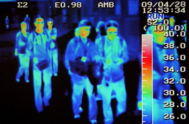 Kiểm tra khả năng nhiễm cúm mới bằng đo thân nhiệt - Ảnh: MTI/EPA