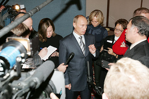 Putin trong vòng vây của giới ký giả sau cuộc “tiếp dân” trực tiếp qua “đường dây nóng” (Hot Line) tại Điện Kremlin, Moscow ngày 18-10-2007 - Ảnh: Văn phòng Báo chí và Thông tin Phủ Tổng thống LB Nga