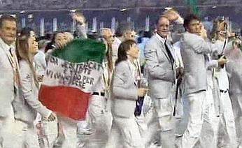 Ilaria Salvatori, một VĐV đấu kiếm của Ý, đã viết mấy dòng chữ lên lá cờ để nhắn nhủ các cổ động viên, nhưng khi vừa rút lá cờ ra, camera đã chuyển ngay sang hình ảnh khác.