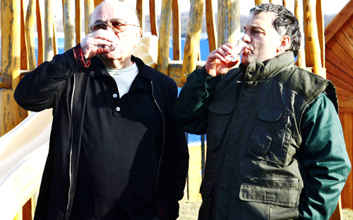 (Chuyện từ năm 2009) Ông Orbán Viktor (phải) dành 1 ngày nghỉ phép để về quê thịt lợn, đây là sở thích của ông. Ông cũng có chia sẻ với báo giới cách làm lạp xường hảo hạng, khiến tay tỉ phú giàu nhất nước Hung Demján Sándor (trái) rất khoái tỉ mỗi khi được mời nhắm với rượu ủ tại gia - Minh họa của Szabó Miklós (blikk.hu)