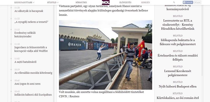 “Tự do Nhân dân” (Népszabadság), nhật báo lớn nhất của Hungary đăng bài về xung đột Việt - Trung với tiêu đề “Nhà máy của Trung Quốc ở Việt Nam chìm trong khói lửa” (Lángba borították Kína vietnami gyárait) - Ảnh chụp màn hình