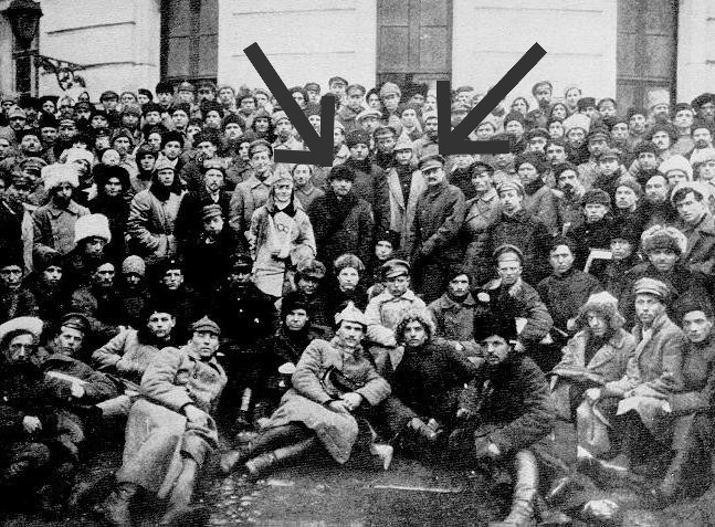 Lenin và Trotsky, hai lãnh tụ chính yếu của Cách mạng Tháng Mười Nga, với các quân nhân Petrograd (1921). Tấm ảnh này về sau đã bị tẩy xóa nhiều lần, mỗi khi Stalin trở thành kẻ thù của một lãnh tụ bôn-sê-vích cựu trào. Chẳng hạn, Trotsky bị xóa ở tất cả các tấm ảnh mà ông từng có mặt cùng Lenin và các nhà lãnh đạo Xô-viết khác, như câu nói từ thời Đại Cách mạng Pháp: "Cuộc cách mạng đã ăn thịt những đứa con của chính nó!"