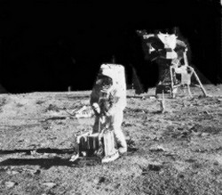 - Đổ bộ lên Mặt trăng trước tiên là một nhiệm vụ chính trị nhằm vào lớp "khán giả" chính là các siêu cường đối nghịch và công luận thế giới; vào dịp đó, các chương trình khoa học chỉ là việc thứ yếu. Tất cả đều được tổ chức, lo toan sao cho "đẹp mắt" nhất. Chẳng hạn, một công cụ đã được treo ngang quốc kỳ Mỹ cắm trên bề mặt Mặt trăng để lá cờ có thể bay ngoạn mục, cho dù trên Mặt trăng không có dưỡng khí và tình trạng không trọng lượng ngự trị ở đó. Chính thủ thuật này, về sau, đã khiến hậu thế cảm thấy nghi ngờ sự xác tín của chuyến thám hiểm Mặt trăng.