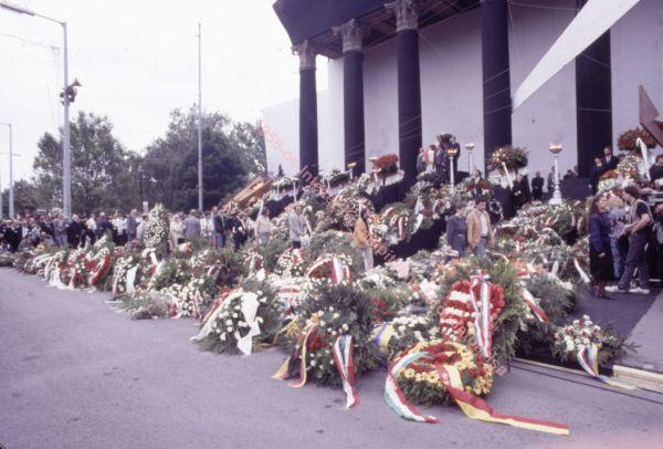 Những vòng hoa trong ngày tái mai táng cố thủ tướng Nagy Imre, được coi là ngày hóa hợp hòa giải của dân tộc Hungary (16-6-1989)