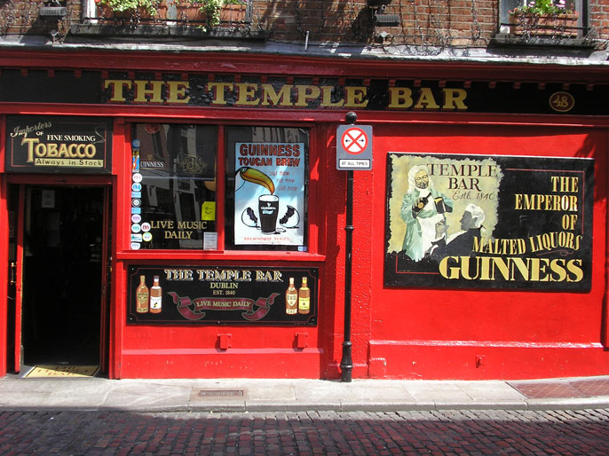 Tuy nhiên, dân Dublin vẫn yêu thích nhất các quán rượu của mình, nơi người ta có thể nhảy múa và chìm mình trong những giai điệu Ireland. Nổi tiếng nhất là các quán rượu ở quận Temple Bar, một quận nhỏ bên bờ sông Liffey với những con phố hẹp và những ngôi nhà đầy màu sắc. Tối tối, người ta đến đây, la cà từ quán nọ sang quán kia để uống vài ngụm bia Guinness hay bia Kilkenny. Các quán đều chật ních, mọi người uống đứng, hòa mình trong tiếng nhạc. Vào quán rượu ở Dublin, bạn phải để ý đến trang phục của mình. Có những quán yêu cầu phải ăn mặc lịch sự. Ví dụ như ở Quays Bar, những người gác cổng nhã nhặn sẽ quan sát bạn từ đầu đến chân, và nếu bạn mặc quần soóc hay đi dép xăng-đan, họ sẽ nhã nhặn mời bạn quay về. Phần lớn các quán rượu khác thì thoải mái hơn, nơi dành cho giới trẻ. Nhưng tất cả các quán rượu đều nghiêm khắc cấm trẻ vị thành niên. Chủ quán là người ấn định giới hạn tuổi, thường là 18, nhưng cũng có thể là 21.