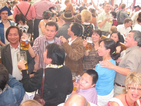 Đoàn chúng tôi đã được thần may mắn dòm ngó đến: dù không đặt chỗ trước lại đông người, nhưng nhờ một „tay trong” là sinh viên Việt Nam làm trong lều, nên sau hơn nửa tiếng chờ đợi hết hy vọng rồi thất vọng, cuối cùng chúng tôi đã được đích thân ông sếp của lều - lại là lều bia HB (Hoffbräu München) to nhất, có sức chứa tới 10.000 người – ký giấy và xuống tận cửa lệnh cho bảo vệ cho cả đoàn vào, oách quá!
